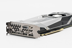 カード長は実測で約267mm(※突起部除く)で,これはGTX 1080 Founders Editionとまったく同じ。2スロット仕様で,ポリゴンをイメージした三角形の凹凸が目を引く外排気型クーラーのデザイン,そして8ピン