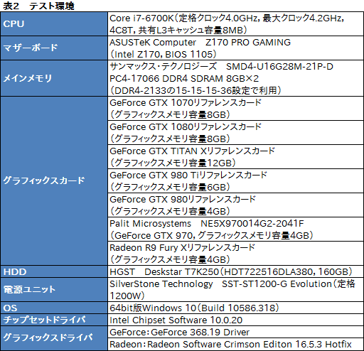 そのほかテスト環境は表2のとおりで,採用するグラフィックスカードとドライババージョン以外はGTX 1080のレビュー時と変わらない。