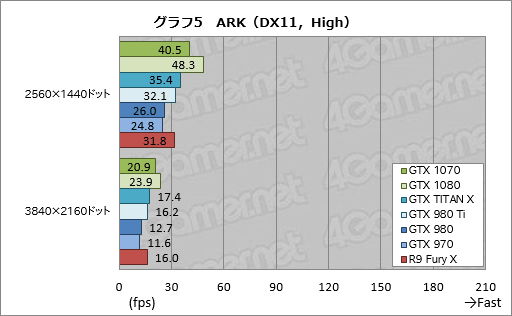 ARKにおいて,GTX 1070はGTX 1080の78〜91%程度のスコアを示した。4条件を見てみると,3840
