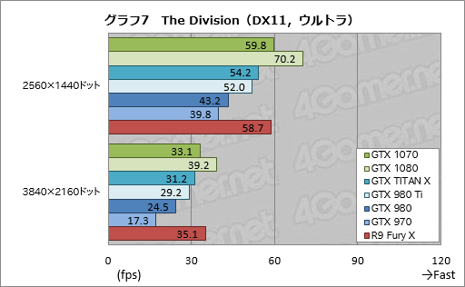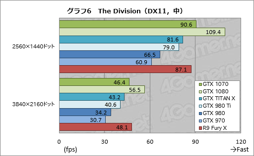 グラフ6.7は「Tom Clancy’s The Division」(以下,The Division)のテスト結果だが,ここでGTX 1070はGTX 1080の82〜85%程度。3DMarkと似た傾向だ。