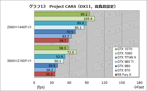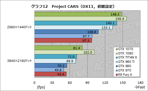 「Project CARS」の結果をまとめたグラフ12,13だと,GTX 1070はテストした全条件でGTX 1080に次ぐ2番手の位置を確保した。スコア自体は81〜95%程度,かつ3840