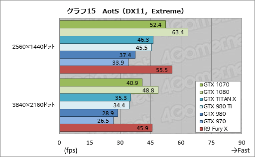 グラフ14,15はAotSの結果だ。ここでGTX 1070はGTX 1080の82〜84%程度,GTX TITAN Xの113〜116%程度と,GeForce同士の比較ではおおむね妥当なスコアに落ち着いたが,一方でR9 Fury Xに対しては89〜94%程度と,明確に置いて行かれてしまった。
