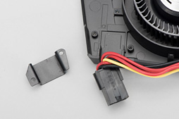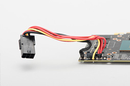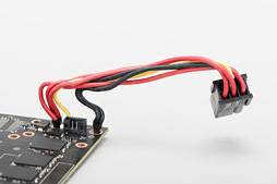 クーラーを完全に取り外した状態から,この特殊な6ピンコネクタを確認してみると,“引き出し元”の基板側では,ファン用の4ピン電源コネクタを挟むような格好で,6ピンコネクタを引き出すケーブルががっちりと基板に半田付けしてあるのが分かる。