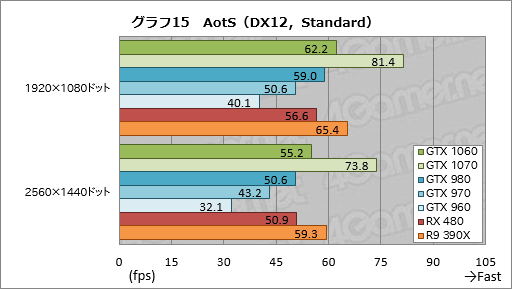 DirectX 12版のテストとなるAotSのスコアがグラフ15,16で,GTX 1060は,RX 480に対して1〜10%程度高いスコアを示す一方,R9 390Xに対しては85〜95%程度と,やや離されている。