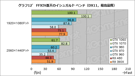 「ファイナルファンタジーXIV:蒼天のイシュガルド ベンチマーク」(以下,FFXIV蒼天のイシュガルド ベンチ)でも,GTX 1060とGTX 980は似たようなスコアになっている(グラフ11,12)。GameWorksタイトルということもあり,対RX 480では15〜31%程度,対R9 390Xでは9〜28%程度と,かなり大きなスコア差を付けている点にも注目しておきたい。