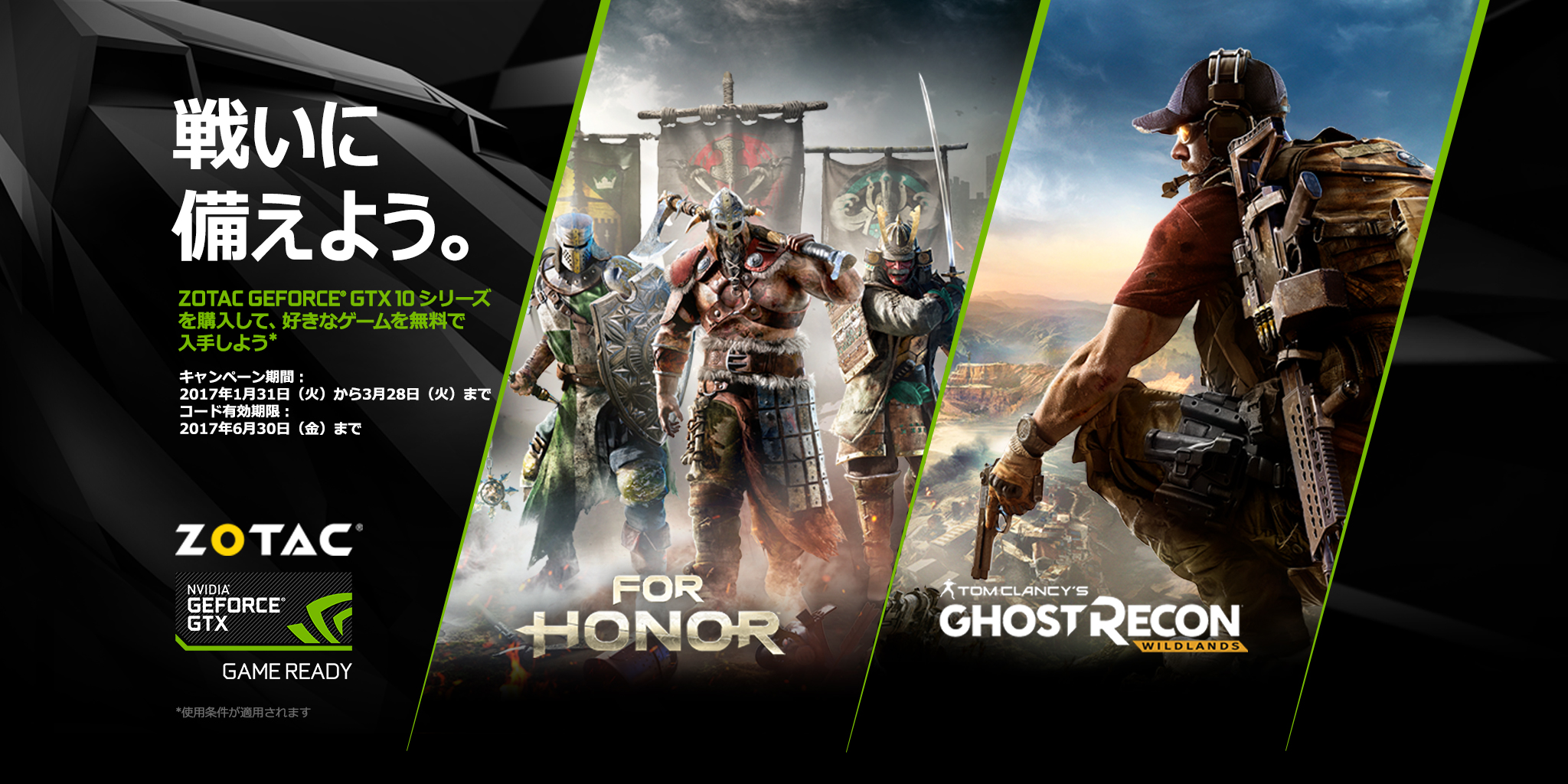 指定のZOTAC製GTX 10カードもしくはZBOX購入で「For Honor」「Ghost Recon Wildlands」の製品版いずれかがもらえるキャンペーン始まる