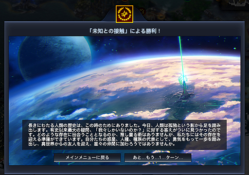 と,ここまではなんのかんので,Beyond EarthはCiv5の変形バージョンといえるだろう。だが最後の最後,まさに「ゲームにどうやって勝つか」という点において,Beyond Earthは非常に特徴的な要素を数多く有する。