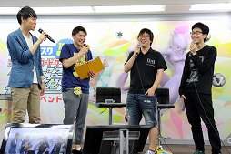 ![]() 「ポケカ」現世界チャンピオンの伊東進太郎氏(右端),「マジック:ザ・ギャザリング」のプロである行弘賢氏(右から2番目)ら,注目選手の対戦は“フィーチャーマッチ”としてニコニコ生放送で映された。 |