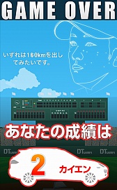 ゲームオーバー時には「なるべく打率の低い打者と対戦したい」「昨日から腹痛い。下痢はしていない」「プロ野球だけが仕事じゃない」といったカイエン青山投手の名言(迷言?)がランダムで表示される。どういうわけか収録数がやたら多く,それ見たさに何度も遊んでしまった(確認しただけでも25種類以上)。