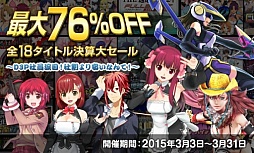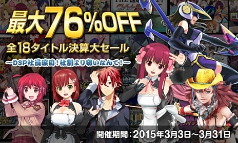 株式会社ディースリー・パブリッシャーは、2015年3月3日(火)から3月31日(火)までの期間限定で、「最大76%OFF 全18タイトル決算大セール〜D3P社員涙目!社割より安いなんて!〜」を実施いたします。