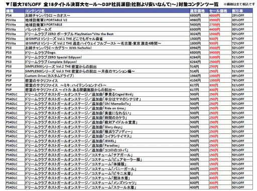 なお、セール名に「〜D3P社員涙目!社割より安いなんて!〜」とあるように、本セールの対象コンテンツはディースリー・パブリッシャーの社員割引よりもはるかに安い価格でご購入いただけます。
