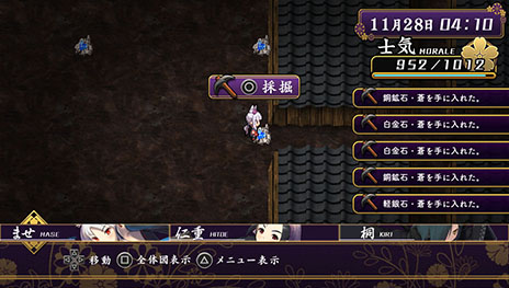 シミュレーションパートでは,ダンジョンに潜って素材を集めて持ち帰り,刀や装飾品を作成できる。作成したアイテムを販売して得られる利益が遊楽街での軍資金となるので,積極的に挑みたいところだ。なお,ダンジョンには異なる特性を持つ