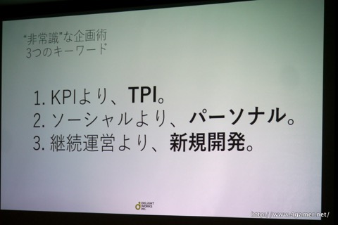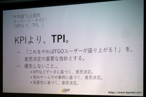 ソーシャルゲームの運営・施策では,ユーザーの課金動向などを示すKPI(Key Performance Indicator:重要業績評価指数)が大きな影響力を持つのが一般的だ。しかしFGOでは,KPIではなく「TPI」という指数を重視しているという。