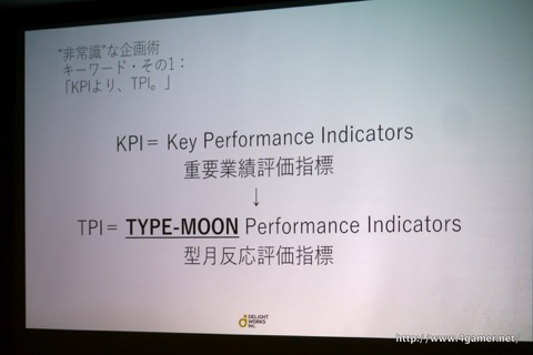 TPIとは耳慣れない言葉だが,これは塩川氏による造語で,TYPE-MOON Performance Indicator(型月反応評価指数)の略。具体的には,打ち合わせにおけるTYPE-MOON(愛称:型月)スタッフ達の反応を重要視するということらしい。