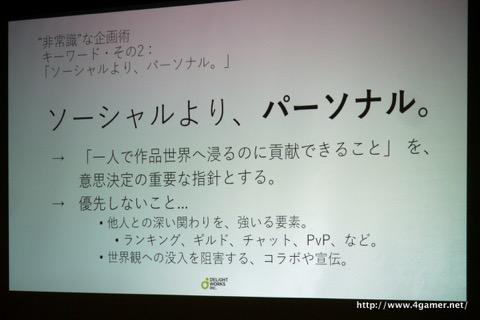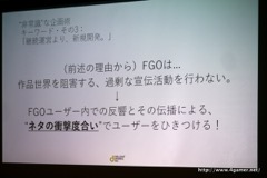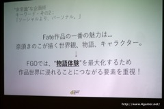 FGOがこうした“非常識”なゲームになった理由は,FateのIPを借りたソーシャルゲームではなく「TYPE-MOONが贈るFate新作RPG」であるという意識で開発したからだという。よりFateらしくあることが優先された結果として,ソーシャルゲームの常識から離れた施策が行われたのだと語った。