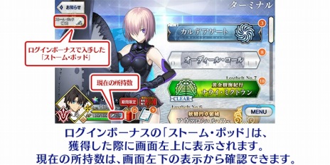 「オーディール・コール 0」をクリアしたマスター(プレイヤー)を対象に「ストーム・ポッド」を入手できる「ログインボーナス」が恒常的に追加されます。