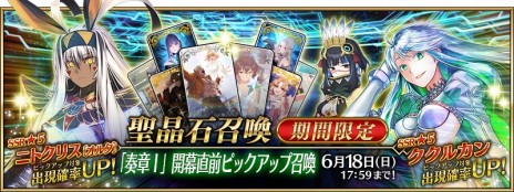 「★5(SSR)ククルカン」「★5(SSR)ニトクリス〔オルタ〕」「★4(SR)テノチティトラン(トラロック)」がピックアップされる期間限定「奏章I 開幕直前ピックアップ召喚」も開催されている。