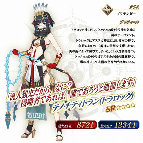 ※「★4(SR)テノチティトラン(トラロック)」は、「トラロック」を霊基再臨第 3 段階にすることで名称が「テノチティトラン」に変化します。