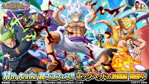 「ONE PIECE トレジャークルーズ」(iOS / Android)は5月12日に11周年を迎えたことを記念し,同日から「11th Anniv.超スゴフェス!! エッグヘッドの激闘編」を開催した。「ルフィ&ゾロ&サンジ 予測不可能な未来島」が新登場し,前週比216%の増収につながった。
