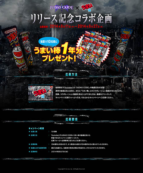 「JUDAS CODE」の発売を記念して、トライエースおなじみ企画、国民的駄菓子「うまい棒」とのコラボレーションキャンペーンが決定しました。期間限定でYoutubeに「JUDAS CODE」の動画広告が出現します。まれにあらわれる「うまい棒」とコラボレーションした動画を見ることが出来た方は、キャンペーンページへ行くことができ、「うまい棒1年分プレゼント」に応募ができます。応募者の中から抽選で10名の方に「うまい棒1年分」をプレゼントします。