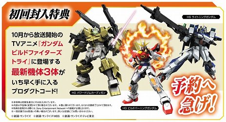 10月から放送開始されたTVアニメ「ガンダムビルドファイターズトライ」に登場する最新機体3体がいち早く手に入るプロダクトコード!