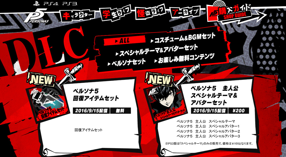 本日発売の「ペルソナ5」でDLC/パッチ1.01情報が公開。無料の回復アイテムセットのほか,有料のPS3/PS4用スペシャルテーマが配信