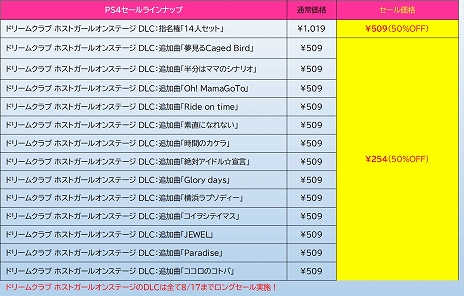 『ドリームクラブZERO』に登場するホストガールと受付さんが一同に会し、最大14人の歌とダンスが楽しめる本作。全員まとめて指名できる「指名権 14人セット」や人気イメージソング「夢見るCaged Bird」や「素直になれない」が追加される「追加曲」など厳選DLC14種が、8/17まで半額で購入可能!ゲームソフト本体は無料なのでまずは気軽に入店してみよう。