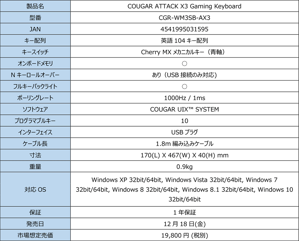 Cherry青軸採用のCOUGAR製英語配列キーボード「ATTACK X3」が,TSUKUMOで先行限定発売