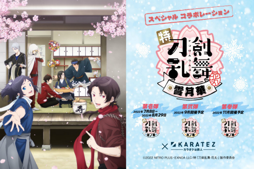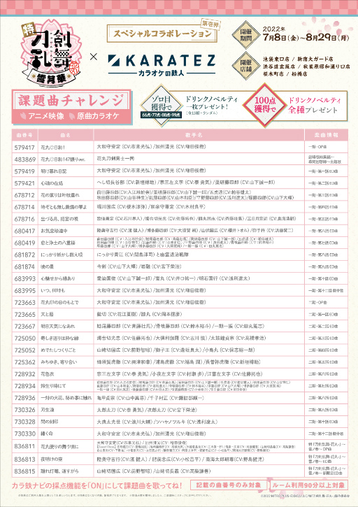 株式会社鉄人化計画(所在地:東京都目黒区、代表取締役社長:根来拓也)は、当社が運営する「カラオケの鉄人」の首都圏6店舗において、三部作連続劇場上映のアニメ「特『刀剣乱舞-花丸-』〜雪月華〜」とのコラボレーションキャンペーン(以下「コラボ」)を、2022年7月8日(金)より開催します。