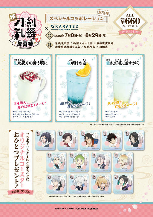 「特『刀剣乱舞-花丸-』〜雪ノ巻〜」オープニング曲・エンディング曲をイメージしたオリジナルコラボドリンクを、各660円(税込)[テイクアウトの場合は648円(税込)]で販売します。コラボドリンク1杯の購入につき1枚のオリジナルコースターを全13種からランダムでプレゼントします。
