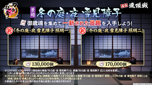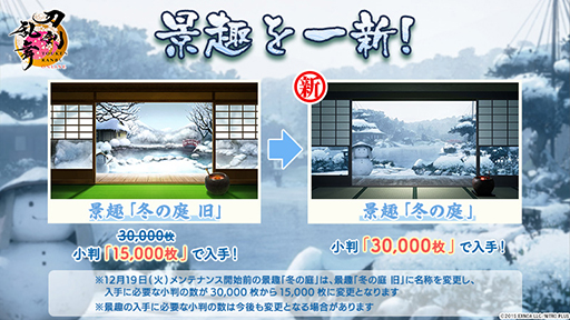 また,景趣「冬の庭」のデザインが一新された。これは小判3万枚を使用して入手可能だ。これまでのデザインの「冬の庭」は,「冬の庭 旧」に名称が変更され,小判1万5000枚で入手できるようになった。