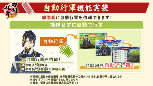 「自動行軍」機能を実装いたします。すでに攻略済の「過去」の合戦場へ出陣する際、部隊長が「特」または極の姿である場合、自動行軍を依頼できます。#刀剣乱舞 #とうらぶ pic.twitter.com/2E4k2pomt6