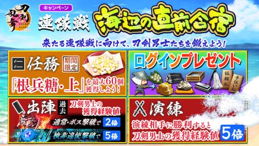 催物「連隊戦 〜海辺の陣〜」開催の準備として「連隊戦 〜海辺の直前合宿〜」キャンペーンも開催中だ。さまざまなアイテムが入手できるログインプレゼントや獲得経験値がアップするキャンペーンなどが始まっている。