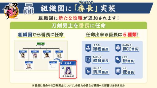 番長は,組織図に追加された新たな役職だ。用意されているのは「総務番長」「勘定番長」「教育番長」「厨番長」「清掃番長」「蔵番長」の6種類で,それぞれ刀剣男士を1振りずつ任命できる。