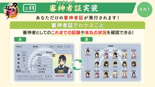 さらに,自分だけの「審神者証」もゲーム内で発行された。これは審神者としてのこれまでの記録や本丸の状況が確認できるもので,画像として保存でき,演練で表示も可能だ。
