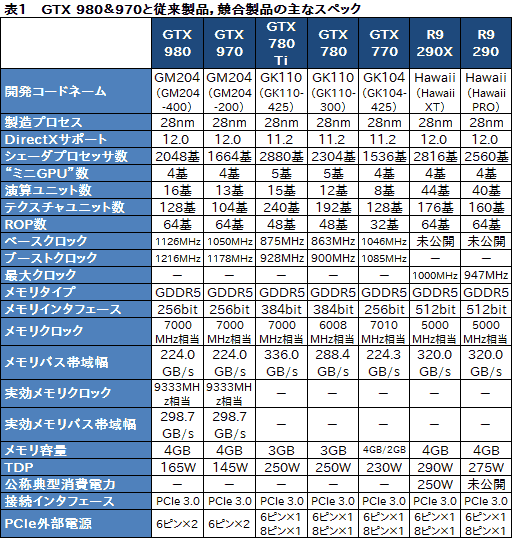 第2世代Maxwellアーキテクチャの見どころはどこにあり,GTX 980とGTX 970がそれぞれどのような位置づけのGPUなのかという点は,西川善司氏が別記事で語ってくれている。なので,本稿では既存のGPUとの違いを表1へまとめるに留めるが,性能をチェックするうえでのポイントとしては,