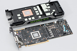 時間の都合で,GPUクーラーの分解は行っていないが,GTX 980では,GPUと接触する銅製のベースプレートに,2本のヒートパイプが打ち込まれる構造になっているという。通常,ヒートパイプは中に封入されたガスを用いて熱移動を行うが,GTX 980リファレンスカードにおいては,ヒートパイプに純水を封じ込め,それによって熱伝導効率を高めているとのことである。“超簡易液冷”といった感じだろうか。