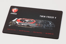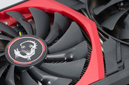 本製品はMSI独自GPUクーラーの最新世代モデル「Twin Frozr V」(ツインフローザー5)を搭載するのが大きな特徴だ。基板長自体は実測252mm(※突起部除く)ながら,Twin Frozr Vクーラーがカード後方へ同16mmほどはみ出ているため,カード長自体はGTX 980リファレンスカードと変わらないものになっている。