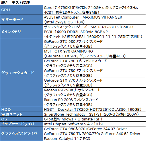 そのほかテスト環境は表2のとおり。GTX 980とGTX 970のテストには,NVIDIAから全世界のレビュワーに配布されたグラフィックスドライバ「GeForce 344.07 Driver」を用いた。ただし,テストスケジュールの都合上,比較対象のGeForceでは本ドライバの入手前にテストを終える必要があったことから,テスト開始時点の最新版となる「GeForce 340.52 Driver」を用いている。結果として,ドライバのバージョンが揃っていないので,この点はあらかじめお断りしておきたい。