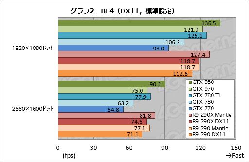 一方のGTX 970は,GTX 780 Ti比で90〜97%程度,R9 290X Mantle比で87〜97%程度と,高負荷設定の2560
