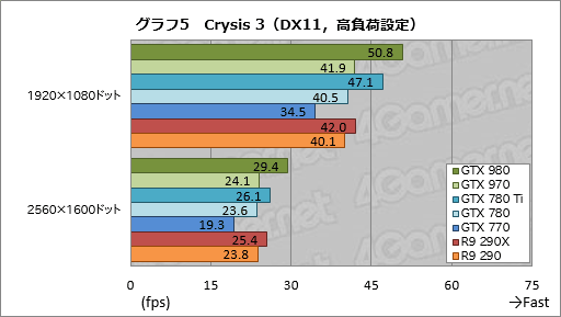 「Crysis 3」のスコアをまとめたグラフ4,5でも,GTX 980の高いスコアが目立つ。具体的には,対GTX 780 Tiで18〜21%程度,対R9 290Xでは10〜22%程度の差がついている。対R9 290Xだと,2560