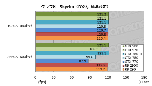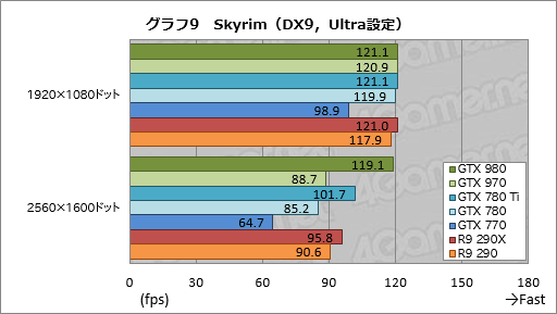 ハイエンドクラスのGPUにとっては“軽すぎる”タイトルである「The Elder Scrolls V: Skyrim」の結果がグラフ8,9となるが,結果は案の定といったところで,ほとんど横並びとなった。公式の高解像度テクスチャパックを持ってしても,GTX 980にメモリ負荷の影響を与えることはできていない。