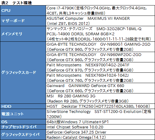 そのほかテスト環境は表2のとおり。テストに用いた「GeForce 347.25 Driver」は,NVIDIAから全世界のGTX 960レビュワーに配布されたものであり,「Catalyst Omega」はテスト開始時点の最新版ドライバである。