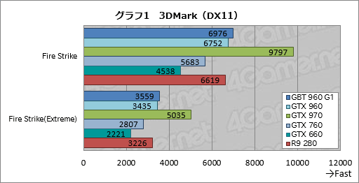 グラフ1は「3DMark」(Version 1.4.828)の総合スコアをまとめたものだ。GTX 970のスコアが完全に抜けているが,実際,GTX 960のスコアはGTX 970比で68〜69%程度に留まっており,ギャップはかなり大きい印象を受ける。
