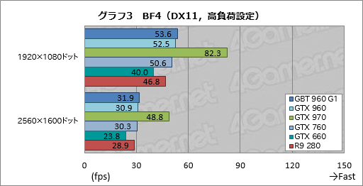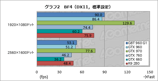 BF4のスコアをまとめたものがグラフ2,3で,ここでもGTX 960とGTX 970のスコア差は大きい。パーセンテージにして,GTX 960は対GTX 970で66〜7%程度なので,おおむね,3DMarkと同じ傾向が出ていることになる。
