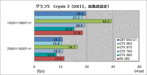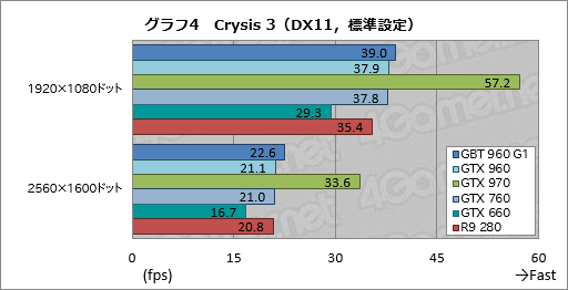 BF4よりもさらに描画負荷の高い「Crysis 3」のテスト結果がグラフ4,5となるが,案の定というかなんというか,GTX 960は,標準設定でGTX 760に並ばれ,高負荷設定では完全に逆転を許してしまった。対R9 280でも同じような感じである。