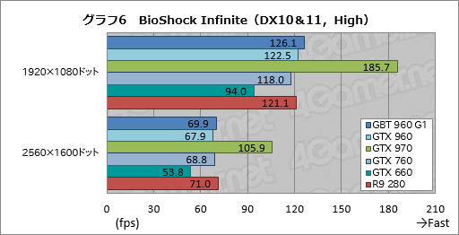 描画負荷が低めのタイトル代表として採用している「BioShock Infinite」の結果を見てみよう(グラフ6,7)。BioShock Infiniteほど“軽い”タイトルなら,GTX 960がGTX 760を安定して上回る……と言いたいところなのだが,標準設定の代わりに用いている「High」設定だと,GTX 960,そしてGV-N960G1 GAMING-2GDもスコアはあまり芳しくない。高負荷設定相当となる「UltraDX11_DDOF」だと,GTX 760に対して9〜10%程度のスコア差を付けているあたり,メモリ周りがうんぬんというのも考えにくいので,正直,この結果は謎である。