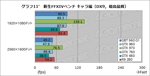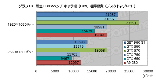 もっとも,384bitメモリインタフェースを持ち,240GB/sのメモリバス帯域幅を持つR9 280と比べると,GTX 960は不利な戦いを強いられる。GTX 960に対して4〜6%程度高いスコアを示すGV-N960G1 GAMING-2GDですら,高負荷設定の2560