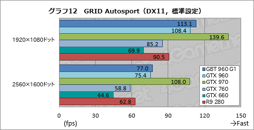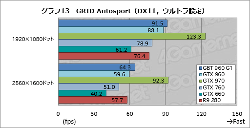 「GRID Autosport」の結果がグラフ12,13だ。GRID Autosportの描画負荷は比較的低めで,かつ,GPUのポテンシャルを素直に出す傾向にあるのだが,ここでのGTX 960はかなり景気がいい。