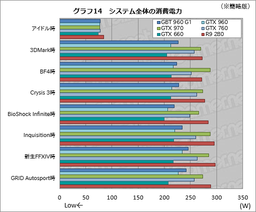 R9 280比で55〜77W低いスコアを示すGTX 960